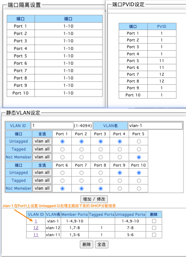 - 注意交换的端口隔离设置为不隔离(1-10 <–> 1-10);