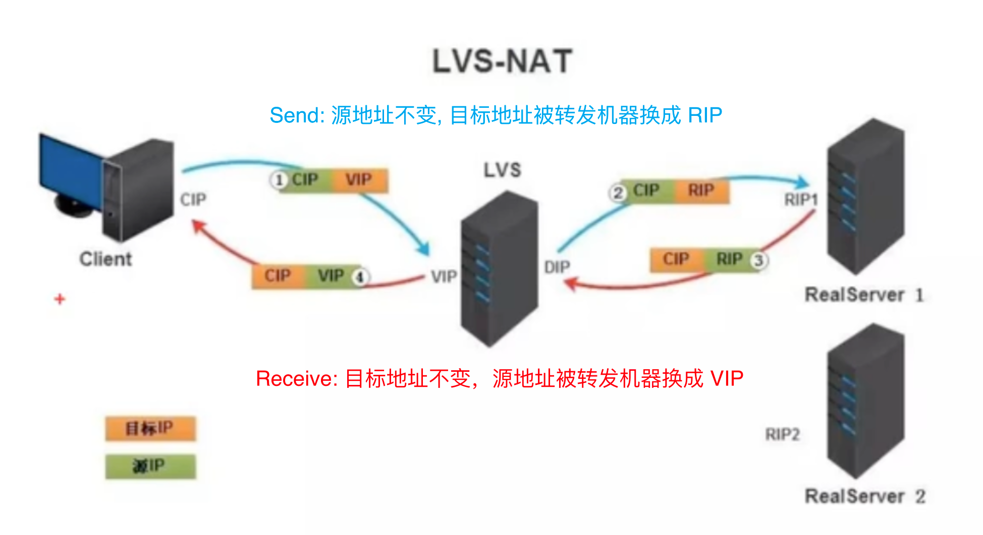 • LVS - NAT 模式, 网络层(三层)转发,标准NAT,要求:LVS同时有WAN与LAN接口,并且与真实主机(RealServer1,RealServer2)在同一个LAN网络