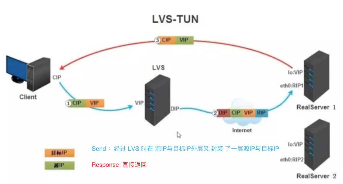 • LVS - TUN 模式, 遂道模式转发, 这种模式支持异地跨越传递