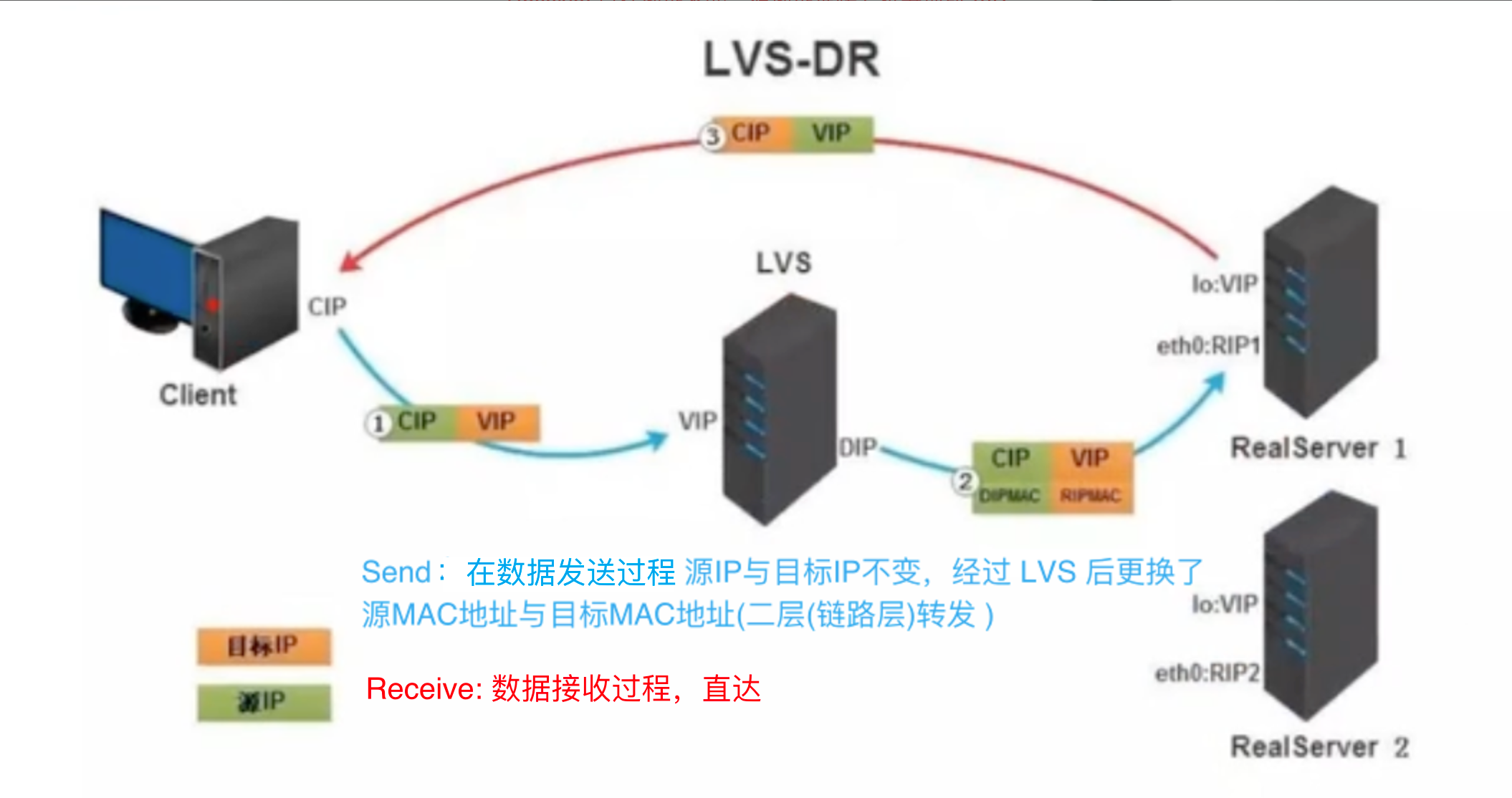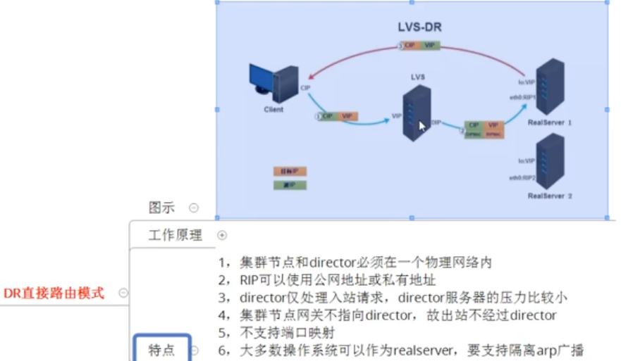 • LVS - DR 模式, 链路层(二层)转发, 要求 LVS与真实主机(RealServer1,RealServer2)在同一个网络