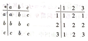 4.已知代数系统(S, *)和(P, ·),其中S={a,b,c}, P={1,2,3}。二元运算分别定义为: