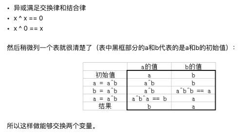 不建议在实际使用中采用这样的写法。这种奇技淫巧虽然看起来十分巧妙,但这样并不见得能够比朴素的交换来的更快。而且这种方法存在一个缺陷:如果 a 和 b 引用的是同一个变量的话,使用这种方法会使得这个变量变为0。
