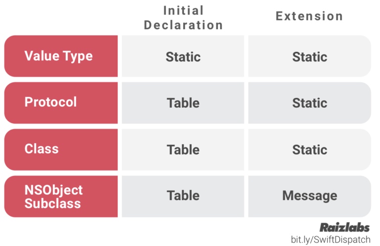 编译型语言有三种基础的函数派发方式: 直接派发(Direct Dispatch), 函数表派发(Table Dispatch) 和 消息机制派发(Message Dispatch)。Java 默认使用函数表派发, 但你可以通过 final 修饰符修改成直接派发. C++ 默认使用直接派发, 但可以通过加上 virtual 修饰符来改成函数表派发. 而 Objective-C 则总是使用消息机制派发, 但允许开发者使用 C 直接派发来获取性能的提高。Swift里的派发方式如下图: