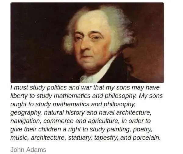 著名思想家约翰· 亚当斯曾经说过:“我必须研究政治和战争,那么我的儿子们也许才会拥有研究数学和哲学、地理学、自然史、军舰建造、航海术、商业和农业的自由,以便给他们的孩子们研究绘画、诗歌、音乐、建筑、雕塑、织艺和陶瓷的权利······”。