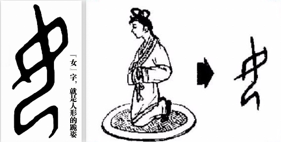 甲骨文 中的“女”字,是一个跽坐的形象。跽,长跪也。长跪即长时间的双膝着地,上身挺直,臀部坐在小腿肚上的一种坐姿。