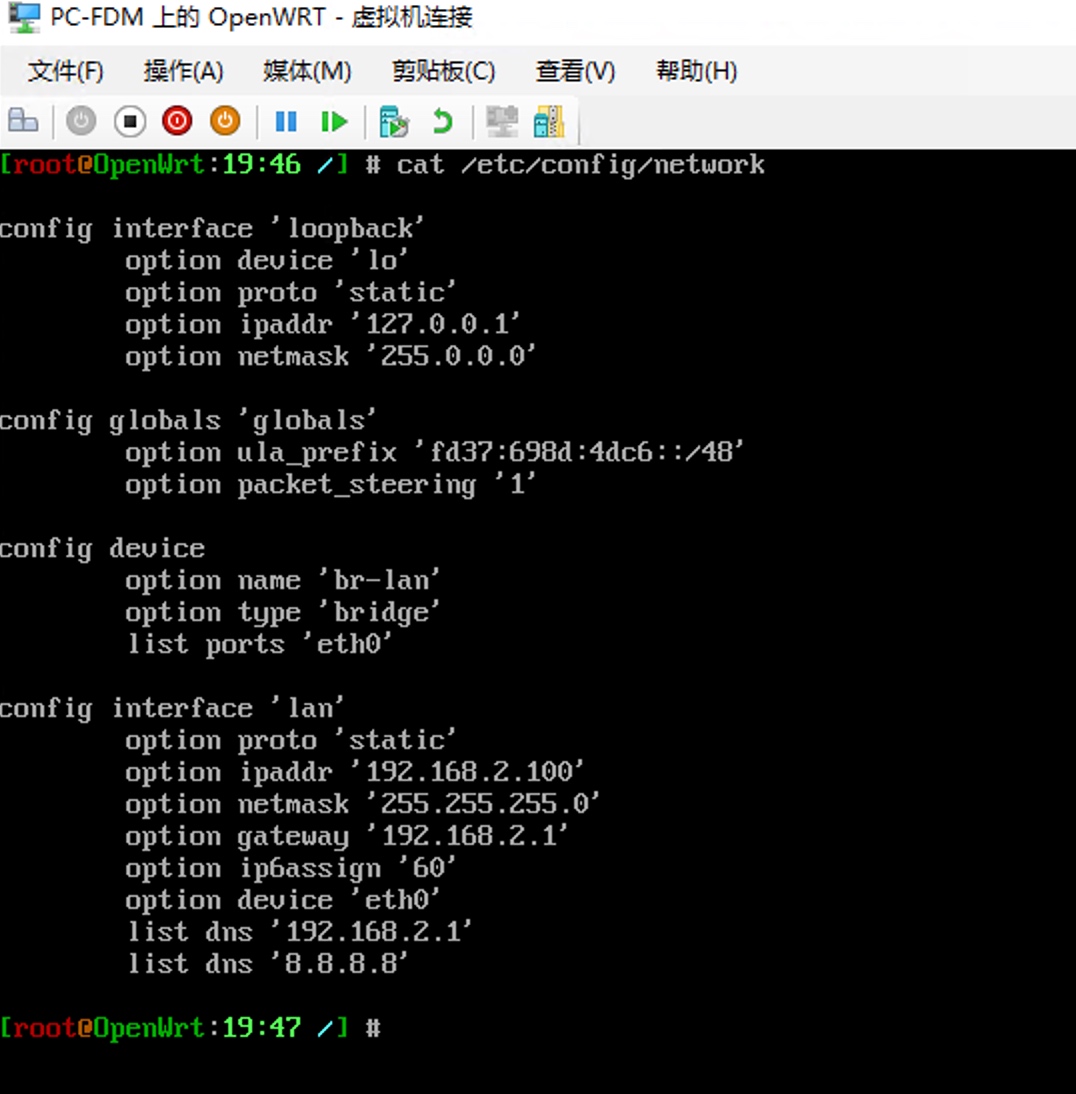 启动OpenWRT虚拟机,并修改lan口的网络配置,ip设置为192.168.2.100,gateway设置为192.168.2.1;