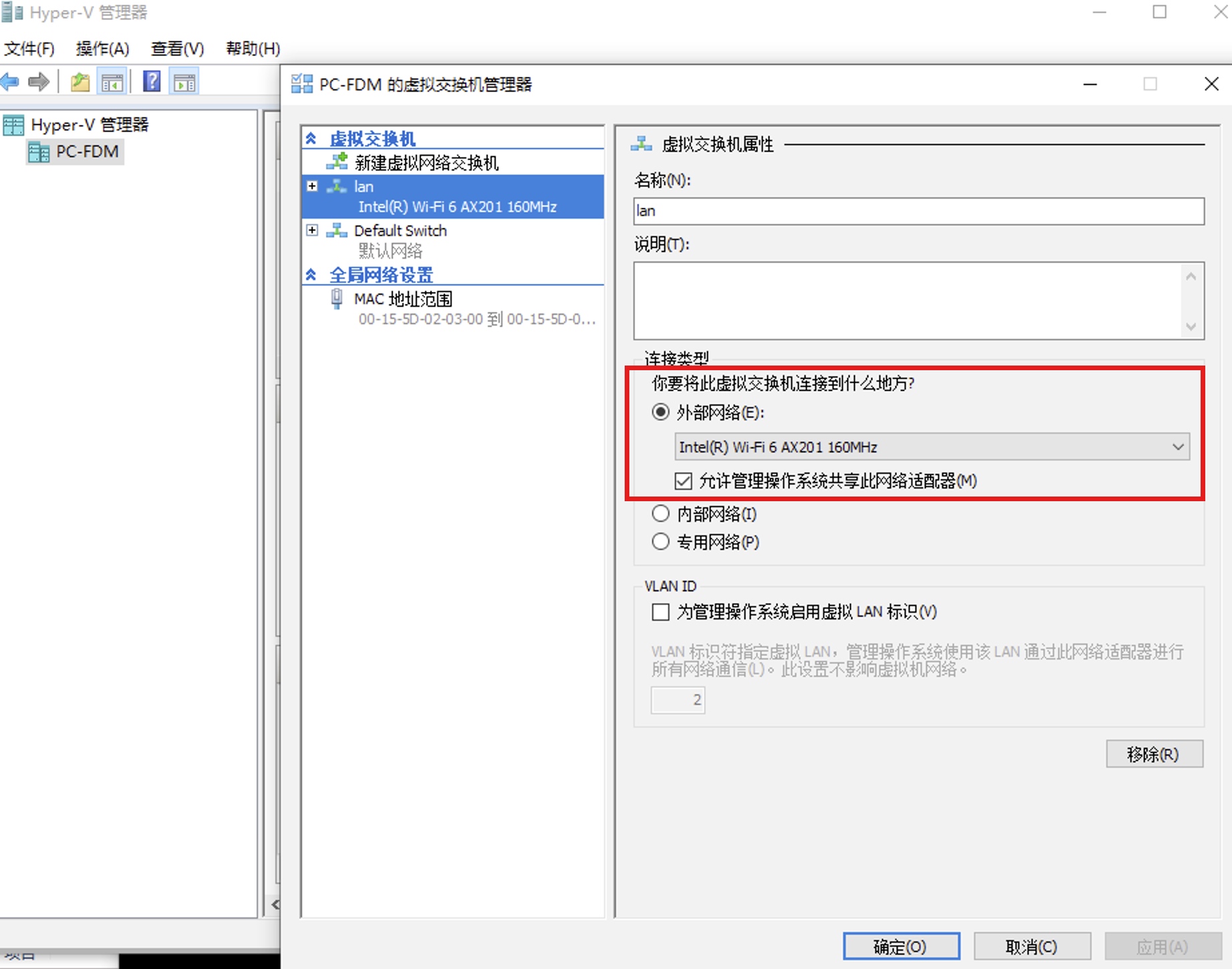 Windows10用Hyper V搭建OpenWRT [分类]: ( 网络配置 ) OpenWRT Lan口配置 1. 在虚拟交换机管理器中添加一个名为lan的虚拟网卡,映射到物理的Wifi无线网卡,这个过程会在windows的网络适配器中自动添加一个网桥联通到WL 2. 给OpenWRT虚拟机添加