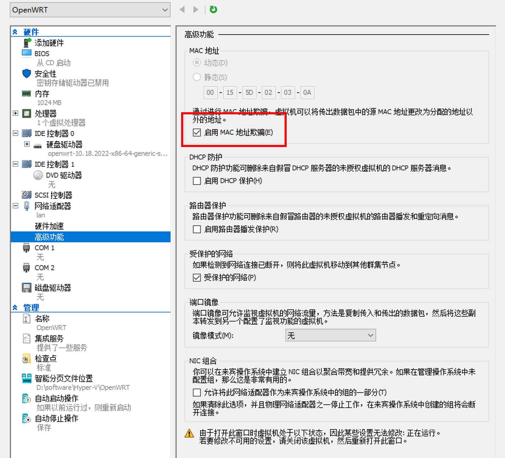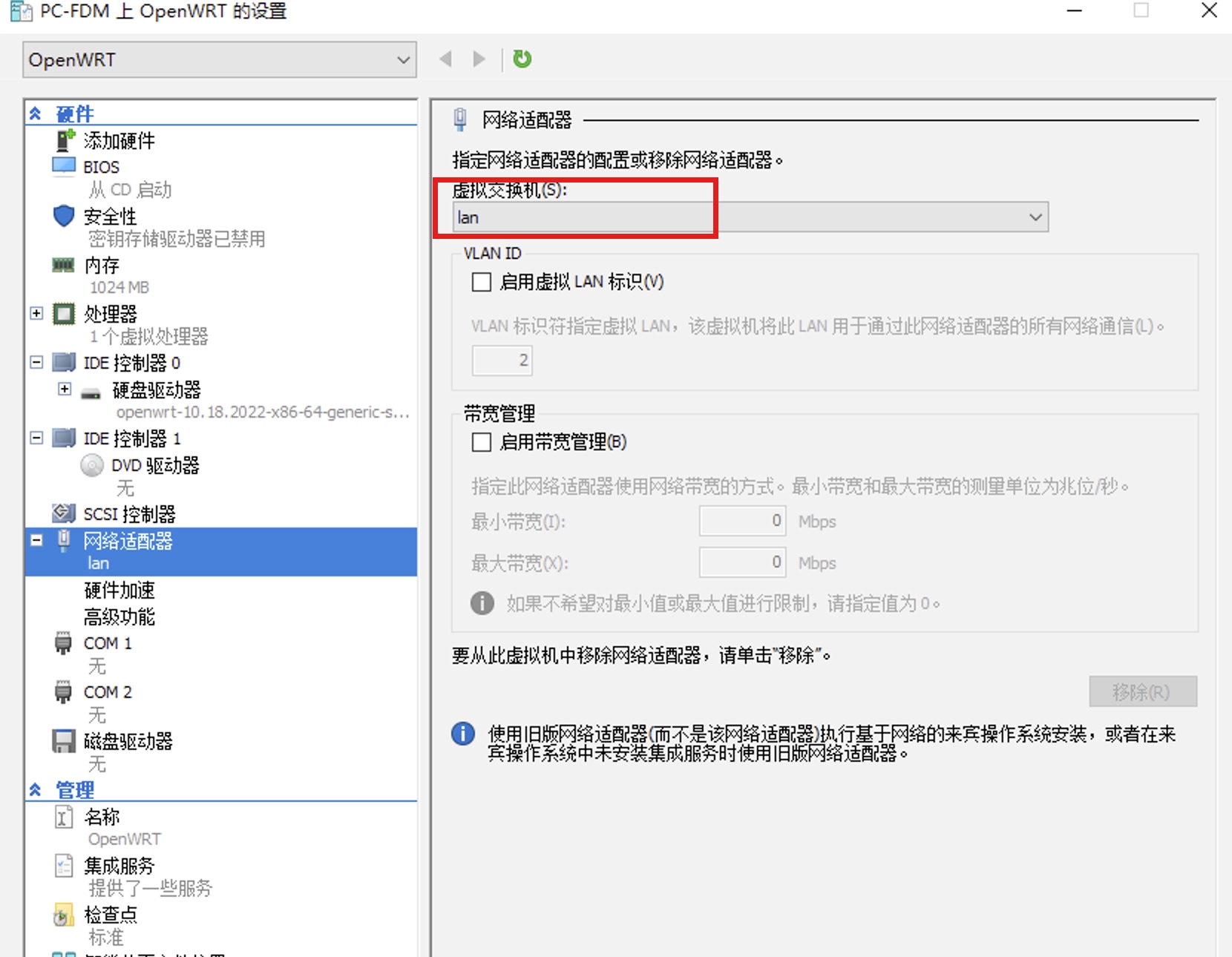 给OpenWRT虚拟机添加一个网络适配器,接虚拟交换机的lan口;