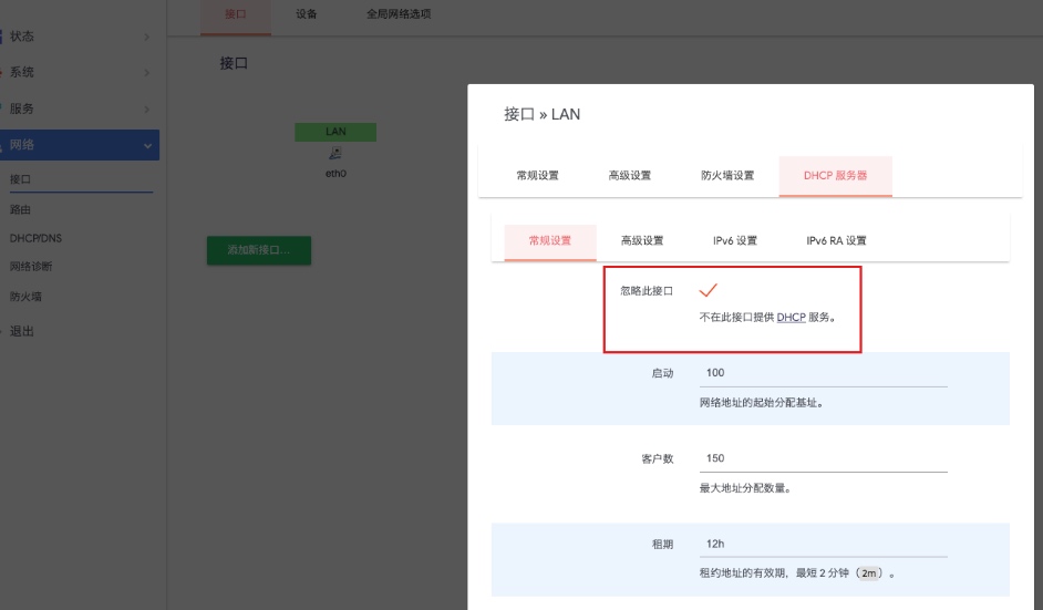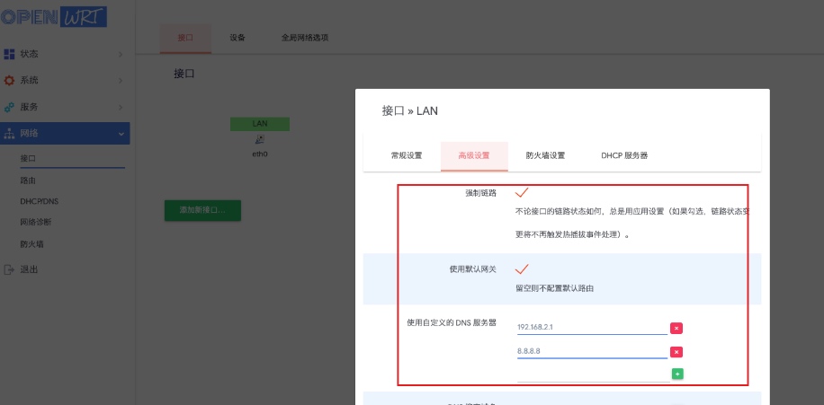 在OpenWRT后台配置默认网关,并关闭DHCP