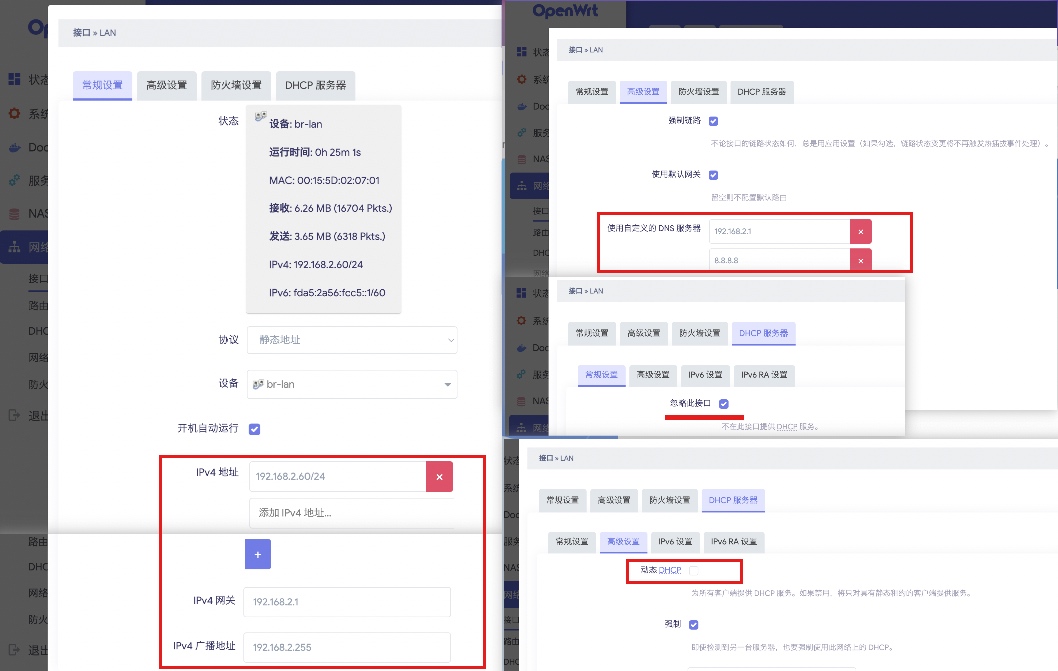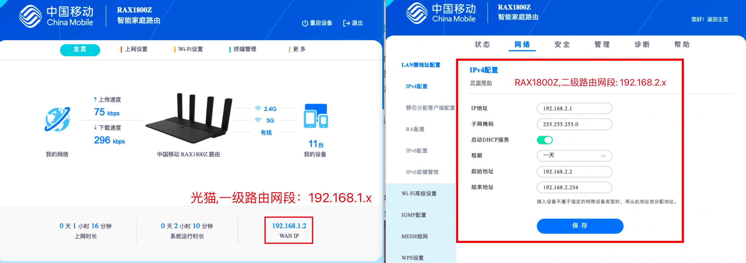 博主这的接入旁路由的路由是以路由方式连接的光猫,所以它是一个二级路由:wan_ip: 192.168.1.2, lan_ip: 192.168.2.1, 具体配置如下图: