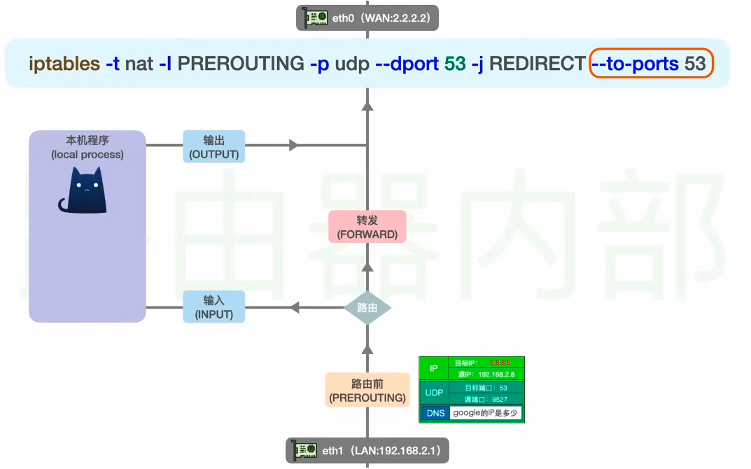 数据包从接口 eth1 进入路由器会经过 PREROUTING 处理(可更改数据包中的源(或目标)地址/端口), 而后会有两条逻辑链路( INPUT(输入链) 与 FORWARD(转发链), 若目标地址在路由器防火墙的同一个区域内部,则让数据包走 INPUT链;若目标地址不在路由器防火墙的同一个区域内,则让数据包走FOARWARD链).