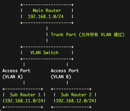 当使用 VLAN 交换机来实现两个不同网段的子路由器下设备的互通时,可以采用以下拓扑结构: