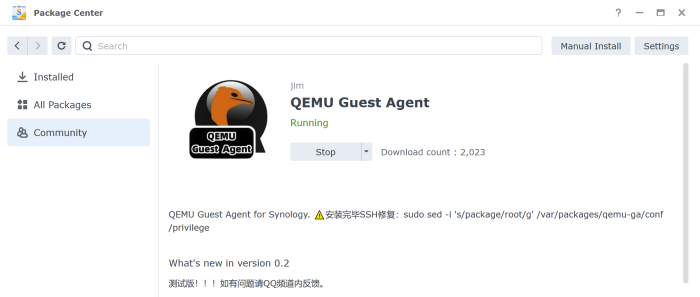 sudo sed -i 's/package/root/g' /var/packages/qemu-ga/conf/privilege
